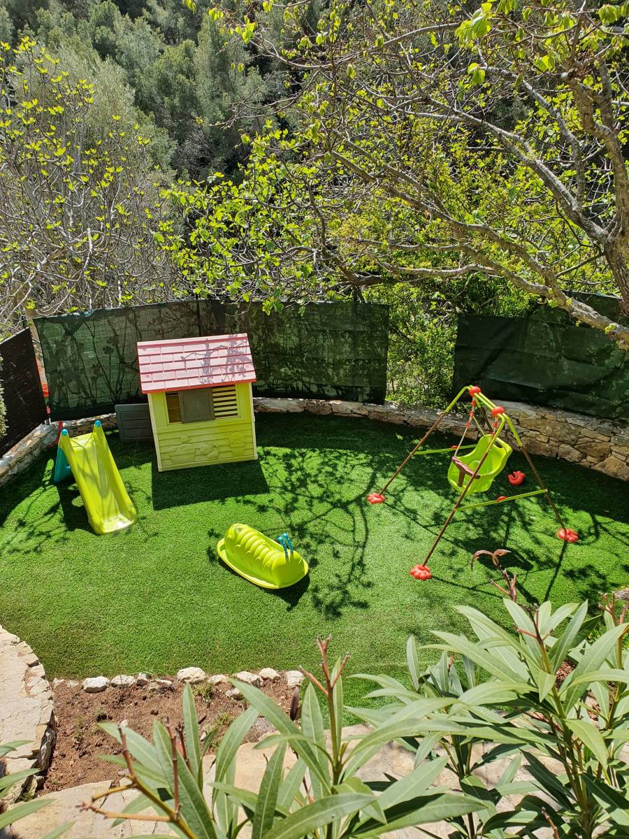 Cet espace ombragé est équipé d'un petit toboggan, jeu à bascule ,petite maison, petite balançoire.